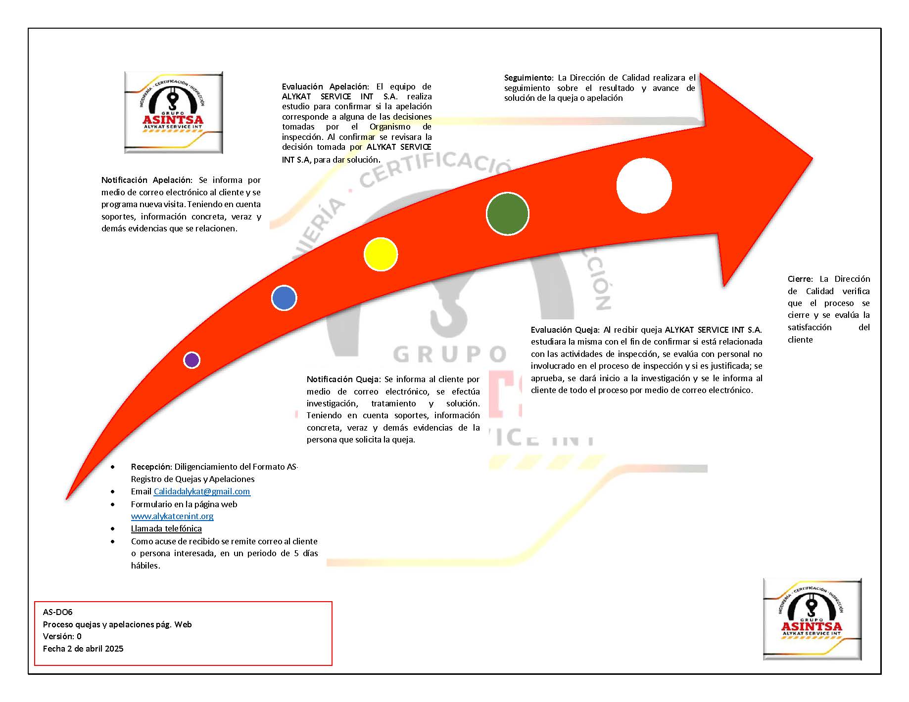En el Organismo de Inspección ALYKAT SERVICE INT S.A., nos comprometemos a gestionar de manera transparente, objetiva e imparcial todas las quejas y apelaciones presentadas por nuestros clientes y partes interesadas. Nuestra política se fundamenta en los siguientes principios: Accesibilidad y Transparencia: Facilitamos canales claros y accesibles para la recepción de quejas y apelaciones, asegurando que cualquier persona pueda presentar su solicitud sin restricciones. Imparcialidad y Objetividad: Todas las quejas y apelaciones son evaluadas de manera justa, sin influencias externas ni conflictos de interés, garantizando la independencia del proceso. Confidencialidad: Protegemos la identidad y la información de los solicitantes, asegurando que los datos sean tratados con la máxima discreción. Proceso Eficiente: Establecemos plazos definidos en nuestro procedimiento interno para la gestión de quejas y apelaciones, asegurando respuestas oportunas y acciones correctivas cuando sean necesarias. Registro y Seguimiento: Documentamos todas las quejas y apelaciones, permitiendo un seguimiento adecuado y la implementación de mejoras en nuestros procesos de inspección. Mejora Continua: Utilizamos la información obtenida de las quejas y apelaciones para fortalecer nuestros procedimientos y garantizar la calidad de nuestros servicios. Cumplimiento Normativo: Nos aseguramos de que el proceso de gestión de quejas y apelaciones cumpla con los requisitos de la norma DGNTI COPANIT ISO/IEC 17020:2014 Evaluación de la conformidad, requisitos para el funcionamiento de diferentes tipos de organismos que realizan la inspección.